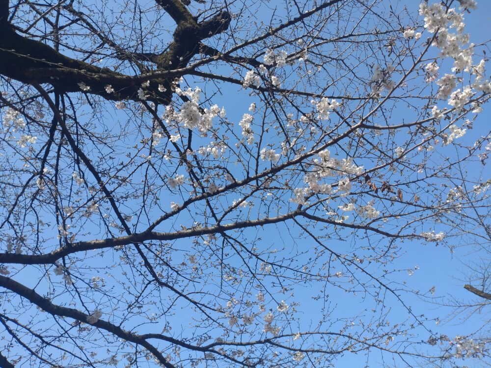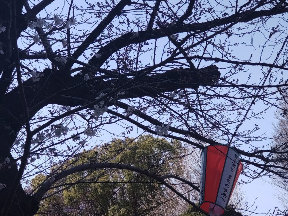 表参道を進みつつ、空を仰ぐと、二分咲き位の桜が視界に。