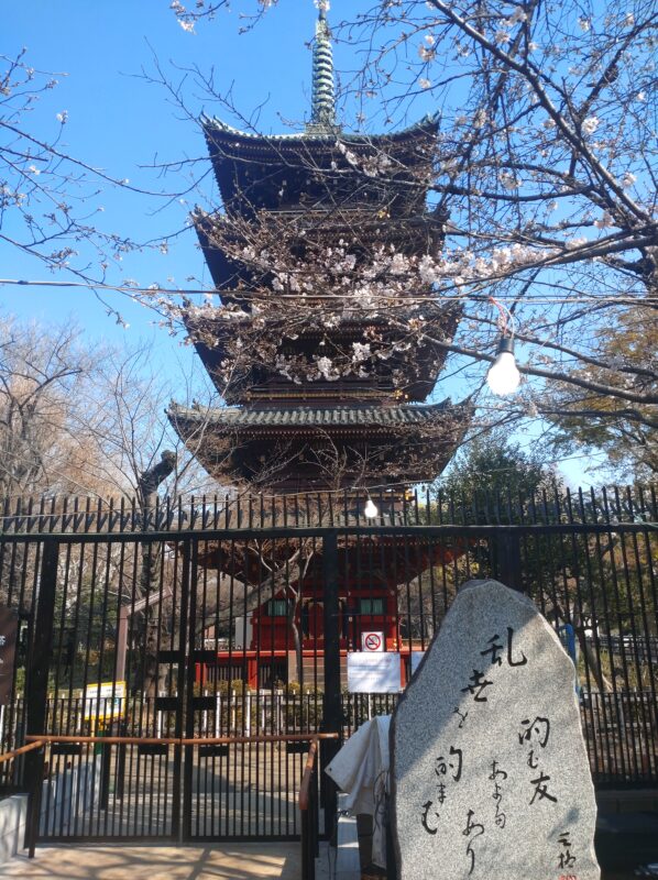 寛永八年(1631年)土井利勝により上野東照宮(寛永四年(1627年)創建)の一部として五重塔が建立、寄進されました。寛永一六年(1639年)火災により焼失、甲良宗広らにより同年再建されたのが、現存する五重塔です。(中略) 塔の高さは約32m。江戸時代の多くの五重塔が初層から第四層までを和風、最上層のみを唐様風とするのに対し、この塔は全層が和風様式です(中略) 関東大震災でも倒壊せず、戊辰戦争や第二次大戦でも焼失を免れた、江戸初期の建築様式を伝える優れた建築の一つとして明治四十四年(1911年)国の重要文化財に指定されました。(以下、割愛)