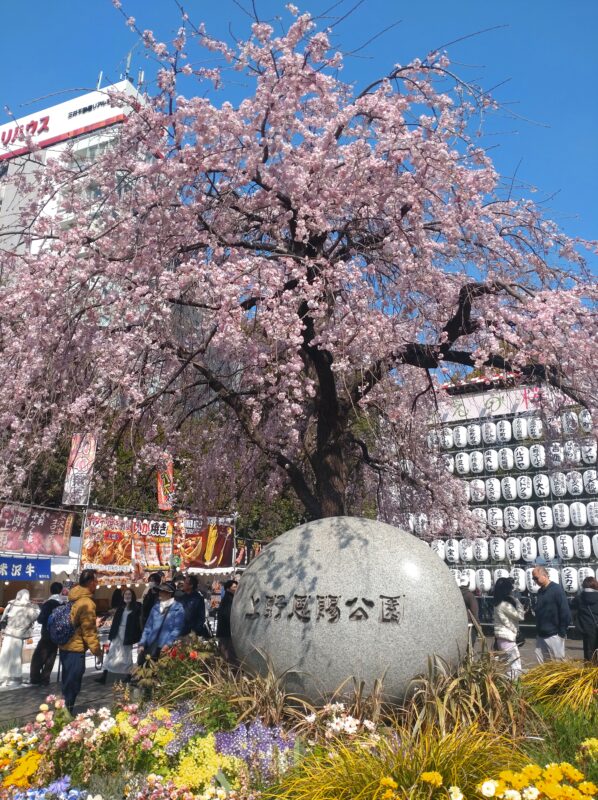 清水観音堂を後にして園路を南下。上野恩賜公園入口まで下りてきました。満開の枝垂れ桜にスマホを向ける人、多数。私も倣うことに。
