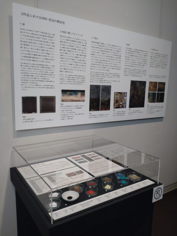 (前略) 東京作品では手前に描かれている4つの人物像すべてにおいて顔の向きや位置が変更されていることがわかります。右側区画では当初、大ヤコブとヘルモゲネスが横に向かい合った構図であったのを鑑賞者に対して正面向きに描き直すという大きな構図変更がなされています。(以下、割愛)
