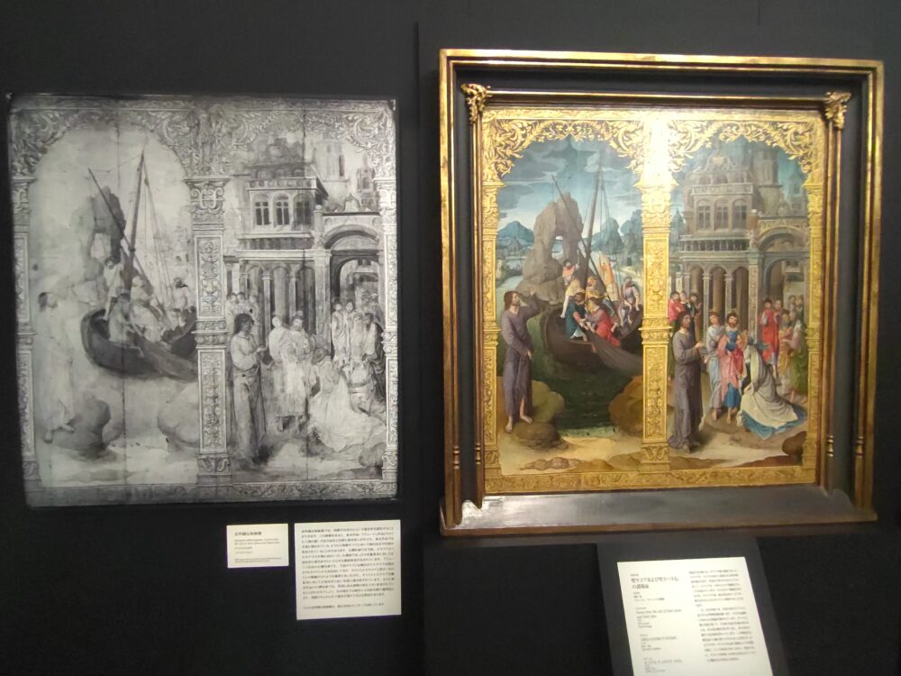 左:赤外線反射画像  右:《聖ヤコブおよび聖ヨハネ伝の諸場面》 1525年 油彩/板 ブリュージュ、フルーニング美術館