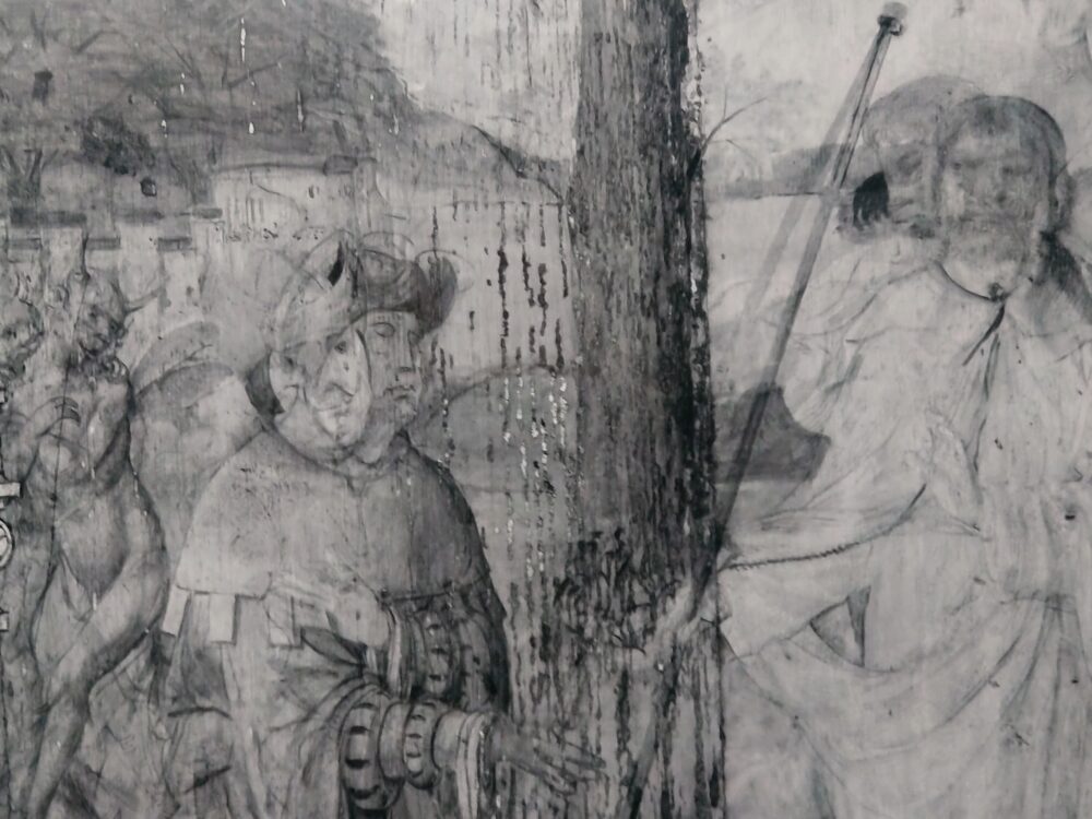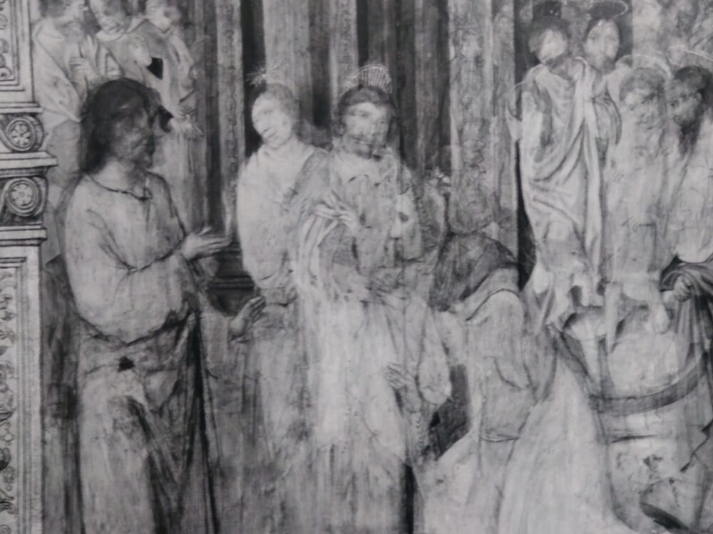 赤外線反射画像では、肉眼では見えにくい下描きを可視化することができます。(中略) ブリュージュ作品の右側区画でも、当初キリストは横向きで大ヤコブは現在よりもキリストの方向を向いており、キリストと大ヤコブと聖ヨハネの3人の視線が合うような構図であったのに、キリストと大ヤコブは鑑賞者に対して正面向きに近い角度に描き直されています。