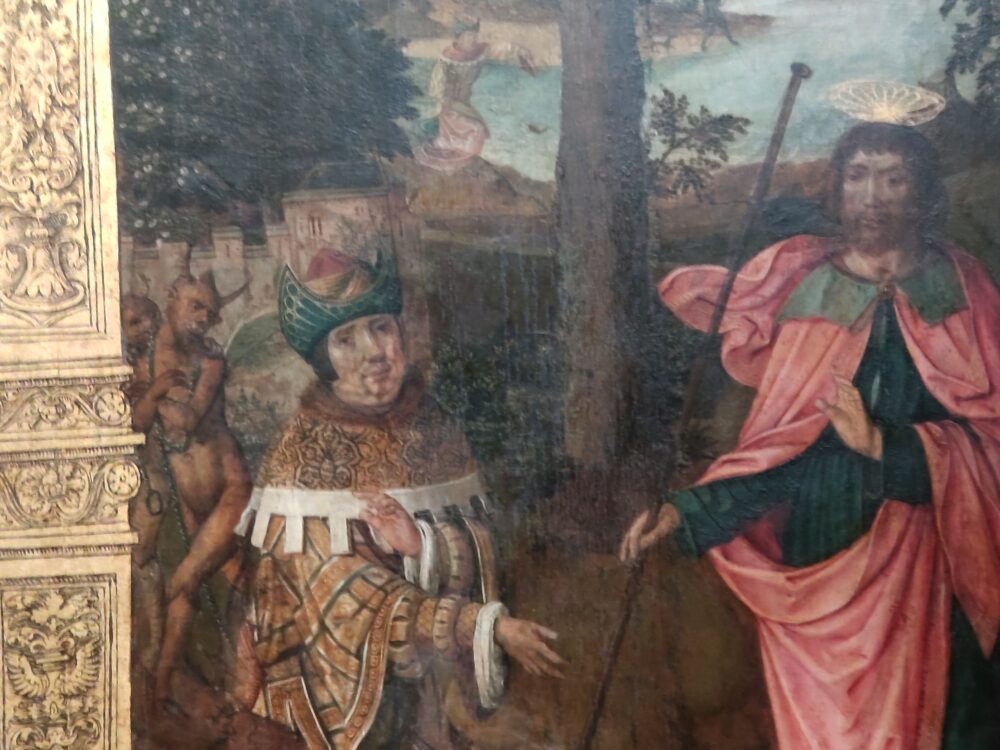 大ヤコブによる魔術師ヘルモゲネス改宗の物語が、2場面にわたって展開します。まず画面左の区画では、大ヤコブのもとに、悪霊たちによってヘルモゲネスが連行されてきています。(中略) 続く右の区画では、悪霊の怒りを恐れるヘルモゲネスに、大ヤコブが自らの杖を護符として与えています。杖は早くも効力を発揮しており、怯えた悪霊たちがこそこそと逃げ出しています。(以下、割愛)