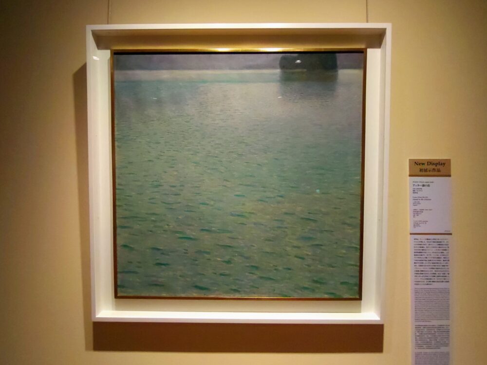 (前略) クリムトの死後を含めて二度のウィーン分離派展に出品されたこの絵画は、先行して1900年に描かれたよく知られた同主題作品(ウィーン、レオポルト美術館)と造形的課題を共有しつつ、それをさらに展開し、より抽象化を遂げた一作です。(中略) また、反復的でありながらも均質ではない無数の短いブラッシュ・ストロークが湖面の波紋を表わすとともに絵画に律動をもたらします。(以下、割愛)