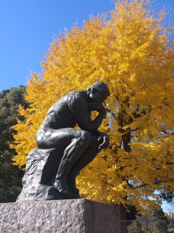 黄葉したイチョウを背景に、ロダン《考える人》を撮影。
