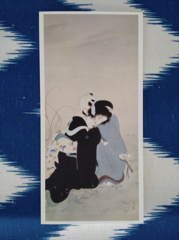 清方39歳の作。本展チラシに大きく掲載されています。大作でもあり、男女の一途な情愛に胸を打たれました。忠兵衛は梅川より幾つか年下かもしれませんね。頼りない男との道行が、遅かれ早かれ死を招くであろうことを予見していたかのような梅川の表情が哀れです。匂い立つ色気を描かせたら、鏑木清方の右に出る絵師はいないのではないか…と思う次第です。