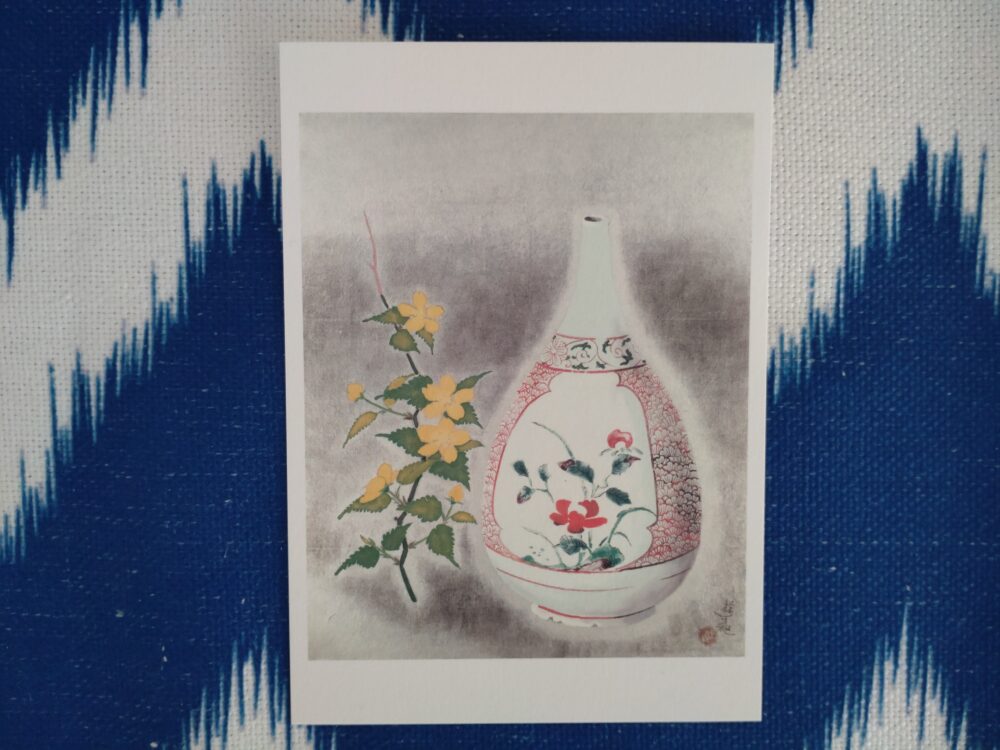遊亀73歳の作。画面左に山吹の枝を、画面右に徳利を描いた作品。2つのモティーフが並列されていることにやや違和感があります。花器ではないため、山吹を生ける選択肢を持たなかったのか。ほぼ正方形の画面を構想していたため、縦長の構図を断念したのか。いずれにせよ、気品ある作風に仕上がっています。銀地の質感が実に良い。色彩が華やかな割に素朴な風合いを持つ徳利も味があります。