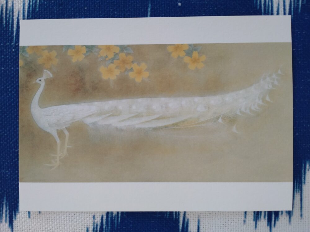 松篁71歳の作品。松園―松篁―淳之。偉大な母(or祖母)を持った息子(or孫)のプレッシャーは小さくなかったでしょうね。横長の画面いっぱいに描かれた白孔雀が幻想的です。胡粉を塗り重ねた箇所もあれば、透けるように描いた箇所もあり、その美しい羽の描写に魅了されます。淡彩で仕立てられた中で唯一、白孔雀の瞳は真っ黒に塗られています。小さい顔に小さい目なので、敢えてインパクトのある色を施したのかもしれませんね。