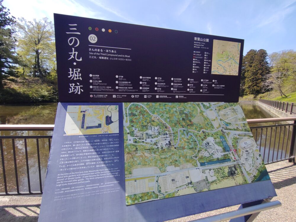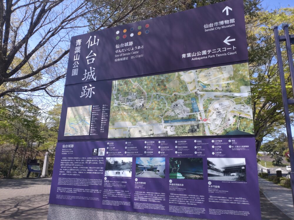 バス停No.5「博物館・国際センター・緑彩館前」で下車。バス進行方向に沿って歩いて行くと、仙台城跡の地図が視界に入ってきました。