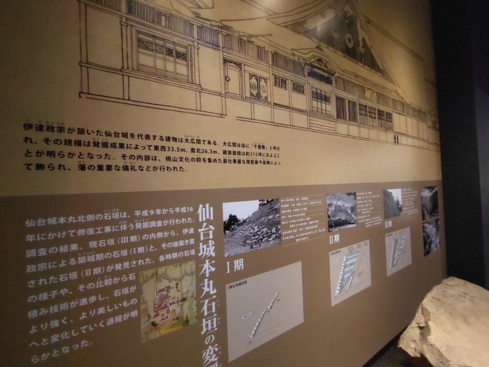仙台城本丸石垣の変遷 仙台城本丸北側の石垣は、平成9年から平成16年にかけて修復工事に伴う発掘調査が行われた。調査の結果、現石垣(Ⅲ期)の内側から、伊達政宗による築城期の石垣(Ⅰ期)と、その後築き直された石垣(Ⅱ期)が発見された。(以下、割愛)