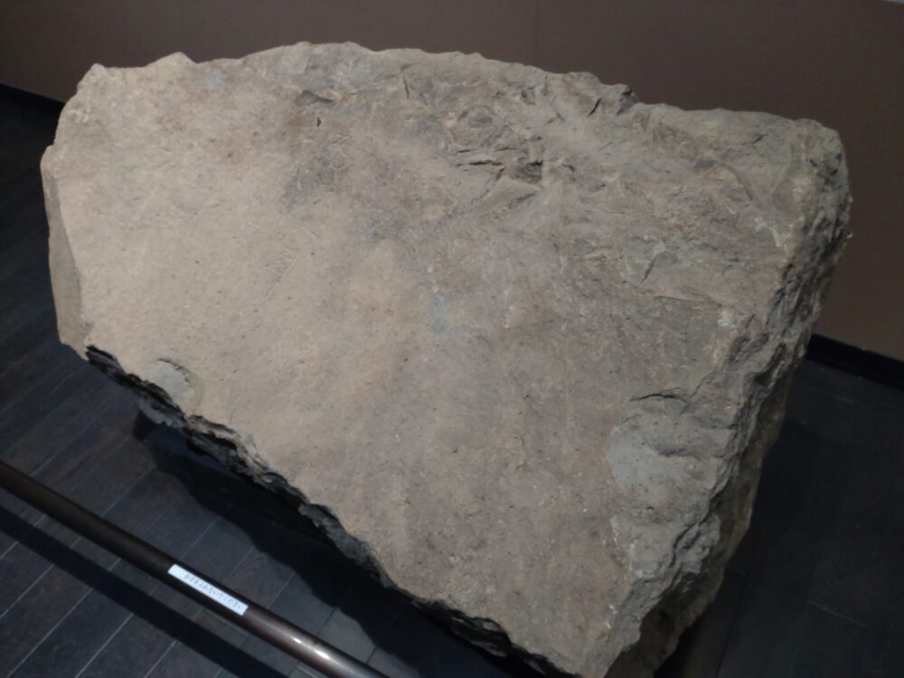 パネル等を撮影していたら、館内ガイドさんが近くに来て解説してくださいました。展示されている石材は、右側が石垣の表、左側が奥なんだそうです。同様に成形された石材が複数並び、まさに楔を打ち込むように石垣が築かれていたとのこと。