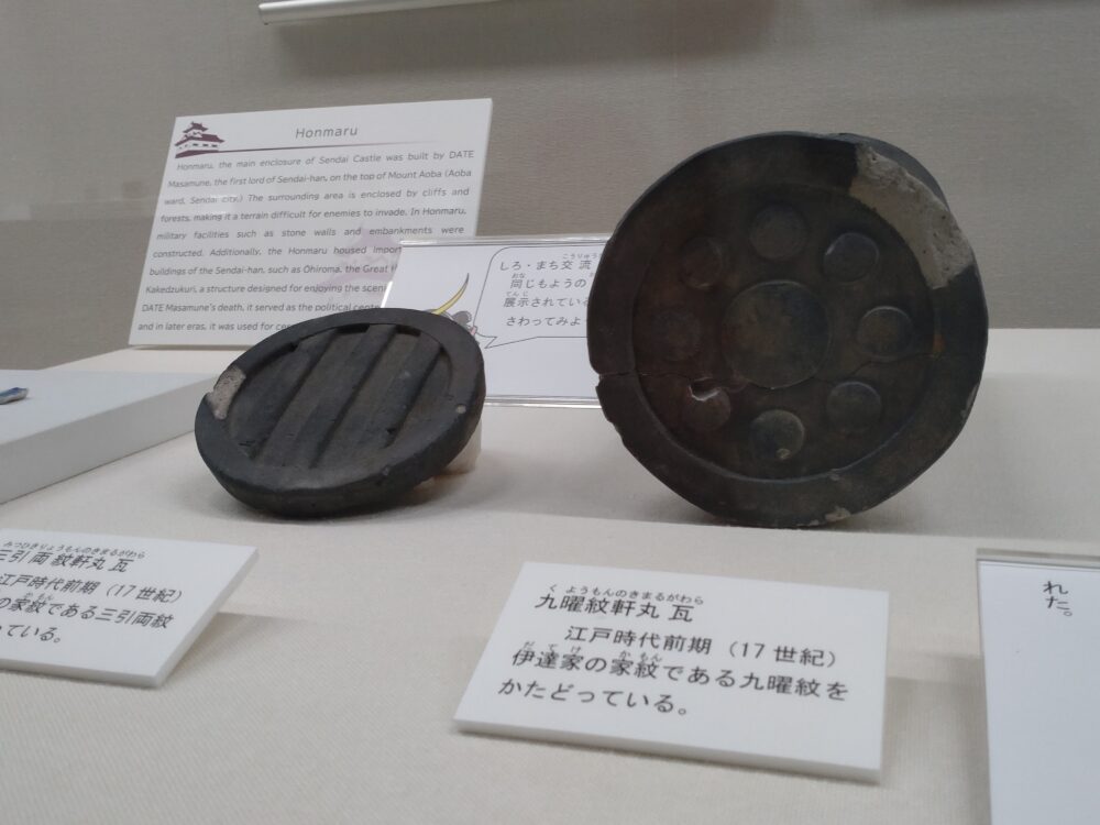 (前略)展示しているのは本丸跡から出土した軒丸瓦で、九曜紋や三引両紋が用いられている。(以下割愛)