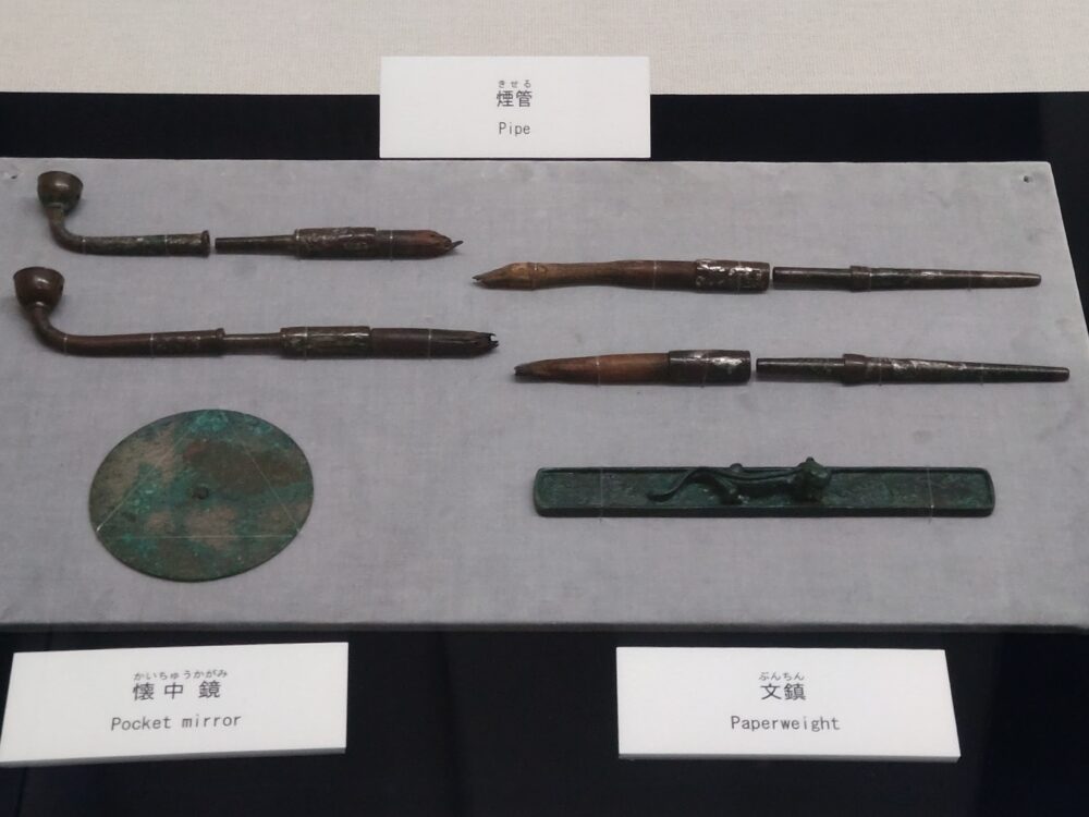 政宗公が愛用されていた品々を拝見。隠居されてからは、書簡をしたためたり、和歌を創ったり、煙草を嗜んだり…。リラックスした日々を過ごされていたのでしょうね。懐中鏡はお母様の形見かしら。