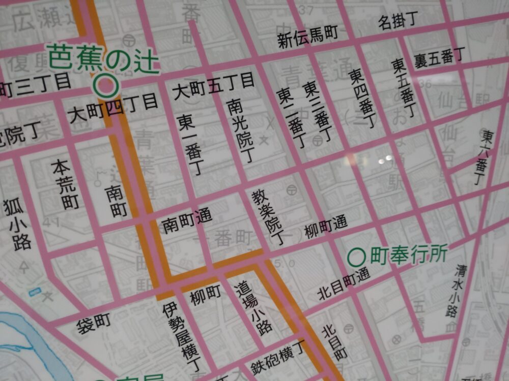 慶長6年(1601)、伊達政宗は仙台城を築くとともに、城下町の整備を始めた。城から東に延びる大町と、南北に通じる奥州街道を基軸に、原則として碁盤の目状の町割を行った。この大町と奥州街道が交差する地点は「札の辻」または「芭蕉の辻」と呼ばれ、高札場が置かれる城下の中心地であった。(以下、割愛)
