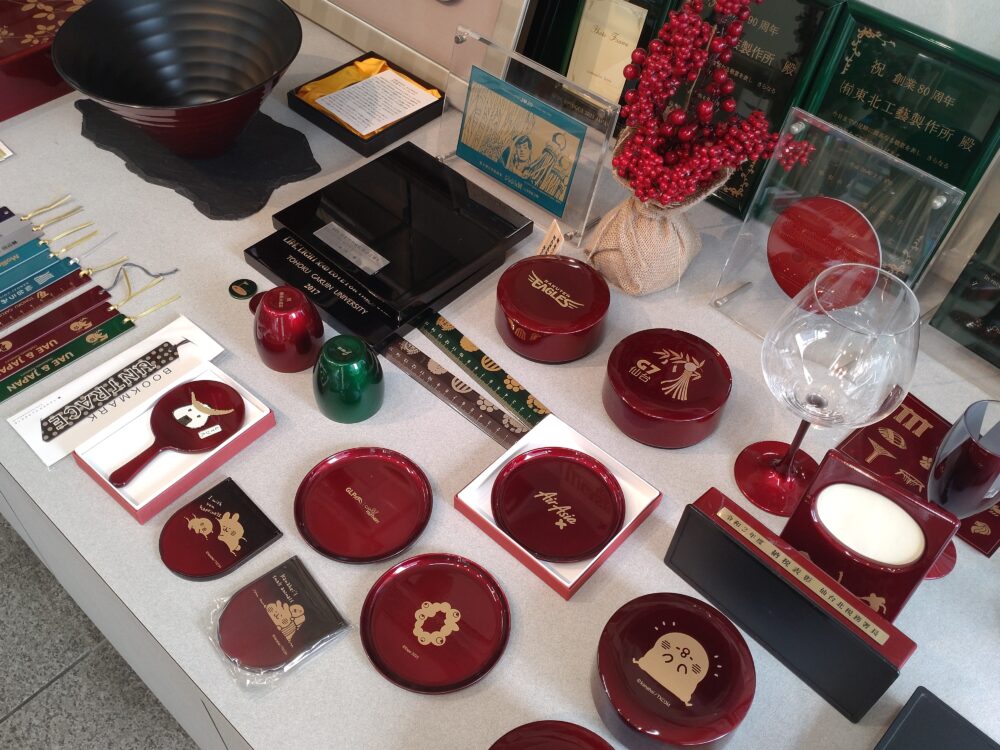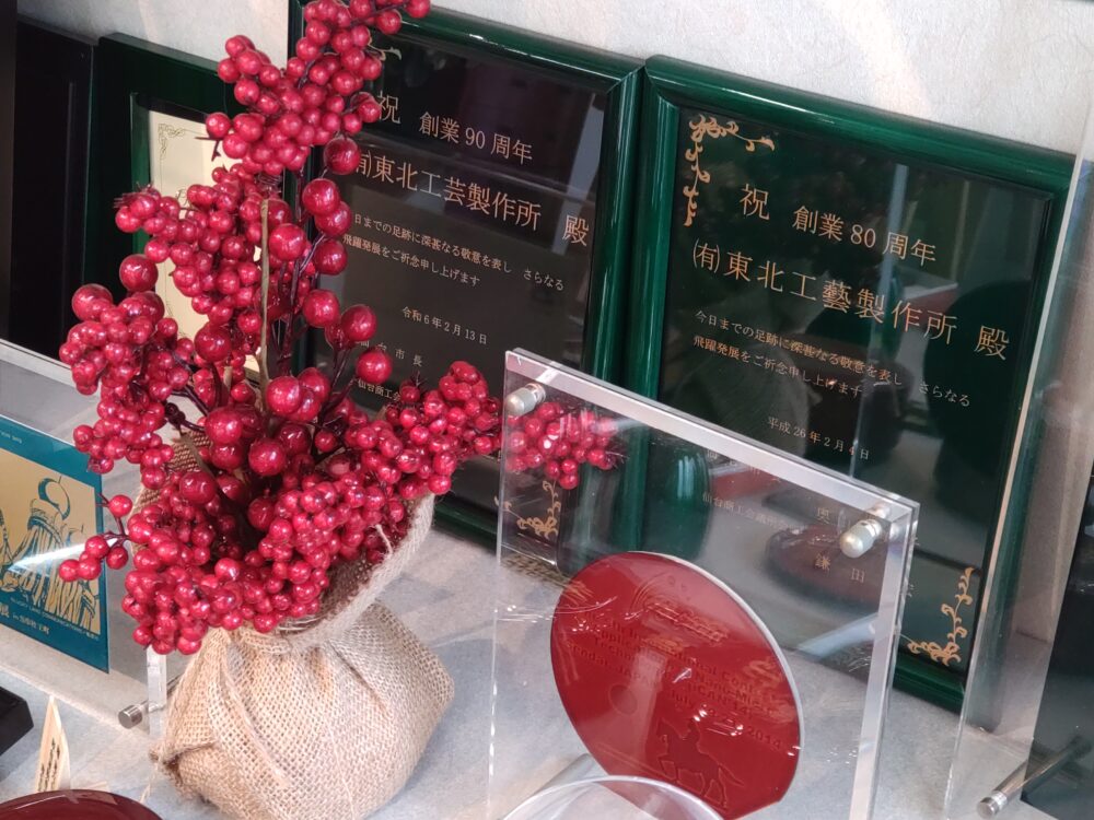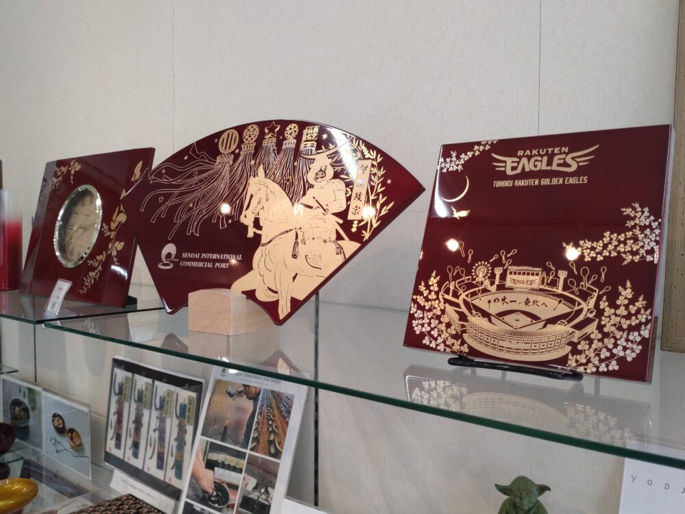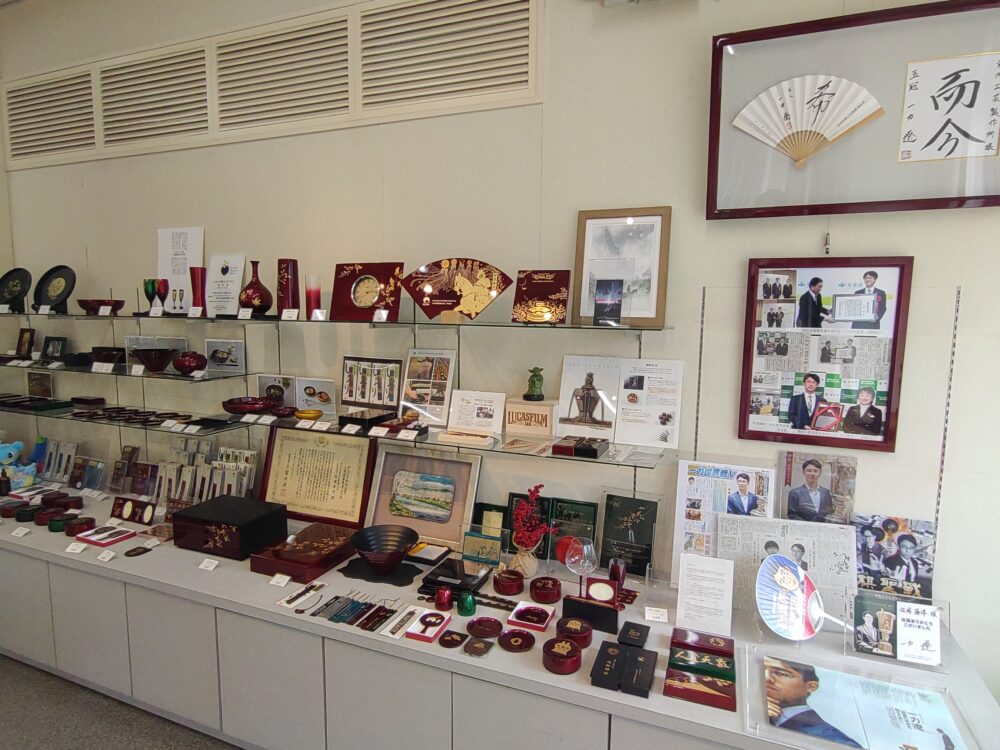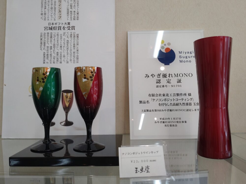 高耐久性漆器として、平成29年(注:2017年)『みやぎ優れMONO』に認定された折の認定証と共に、『日本ギフト大賞』を受賞した時の記事も飾ってありました。