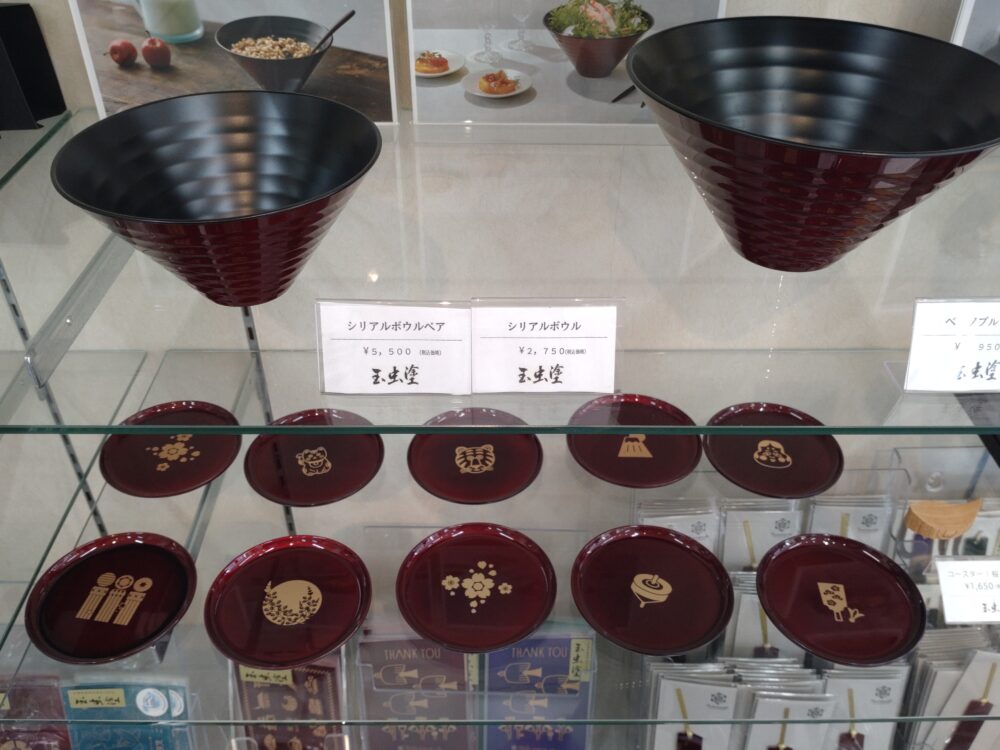 『商品カタログ』によると、玉虫塗シリアルボウルは樹脂製、玉虫塗コースターの素材はABS。こんなお洒落なボウルにシリアルを入れたら、忽ち優雅な食卓に様変わりしそう…。『商品カタログ』に掲載されているコースターの図柄は、桜・七夕・萩・おたふく・富士山・羽子板・駒・招き猫の8種ですが、陳列棚にはもう1種類ありました。
