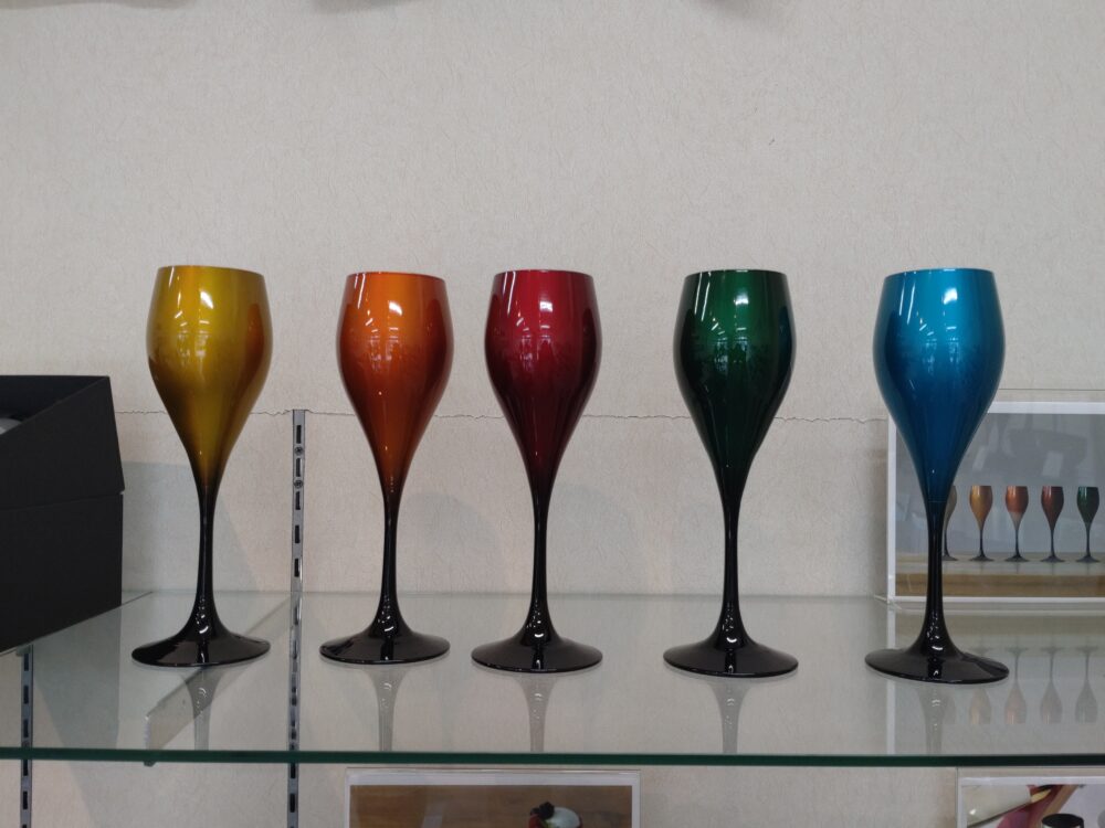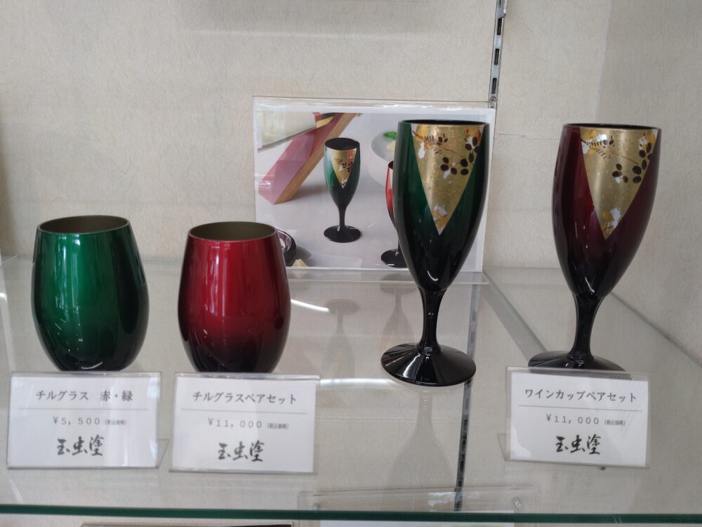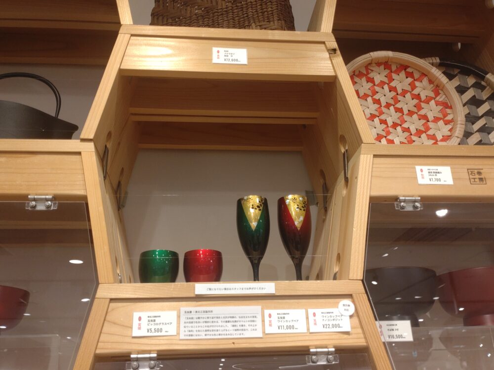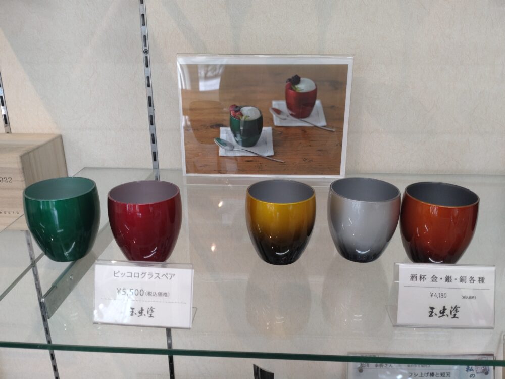 2つ目のコーナーには、玉虫塗ワインカップペアと玉虫塗ピッコログラスペアが並んでいます。高価なナノコンポジットワインカップ(食洗機対応)の方も扱っています。
