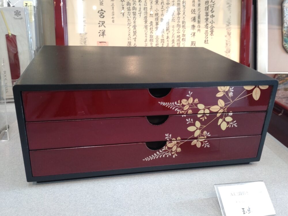木製。蒔絵のないシンプルな三段引出(同サイズ)もあります。