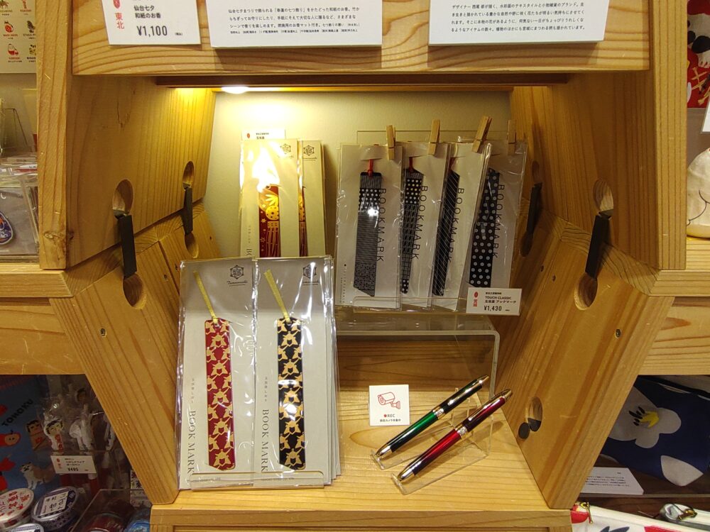 玉虫塗商品は2箇所に分かれて陳列されています。1つ目のコーナーには、ボールペンとブックマーク。公式サイト『商品カタログ』と突き合わせると、ボールペンは玉虫塗複合ボールペン金軸(赤・緑)ですね。玉虫塗ブックマークの方は『商品カタログ』に掲載されていないようです。最近の商品かな?